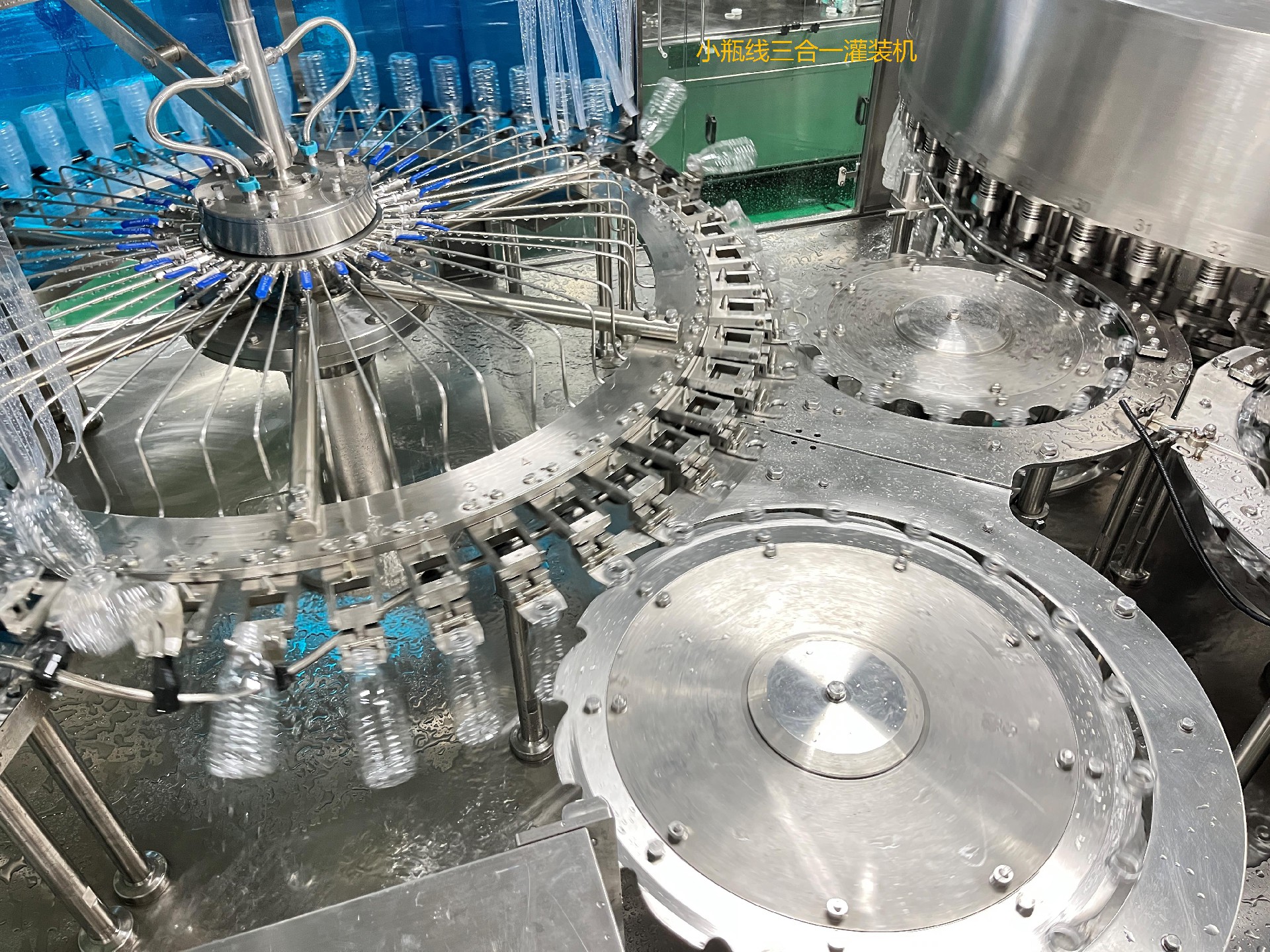 This series of production lines comprises equipment such as automatic bottle blowing machines, automatic rotary filling machines, automatic cap feeding and capping machines, online cap sterilization and washing machines, automatic drying machines, laser coding machines, vertical light inspectors, automatic labeling machines, automatic film wrapping machines (automatic cartoning machines), and automatic palletizers.
